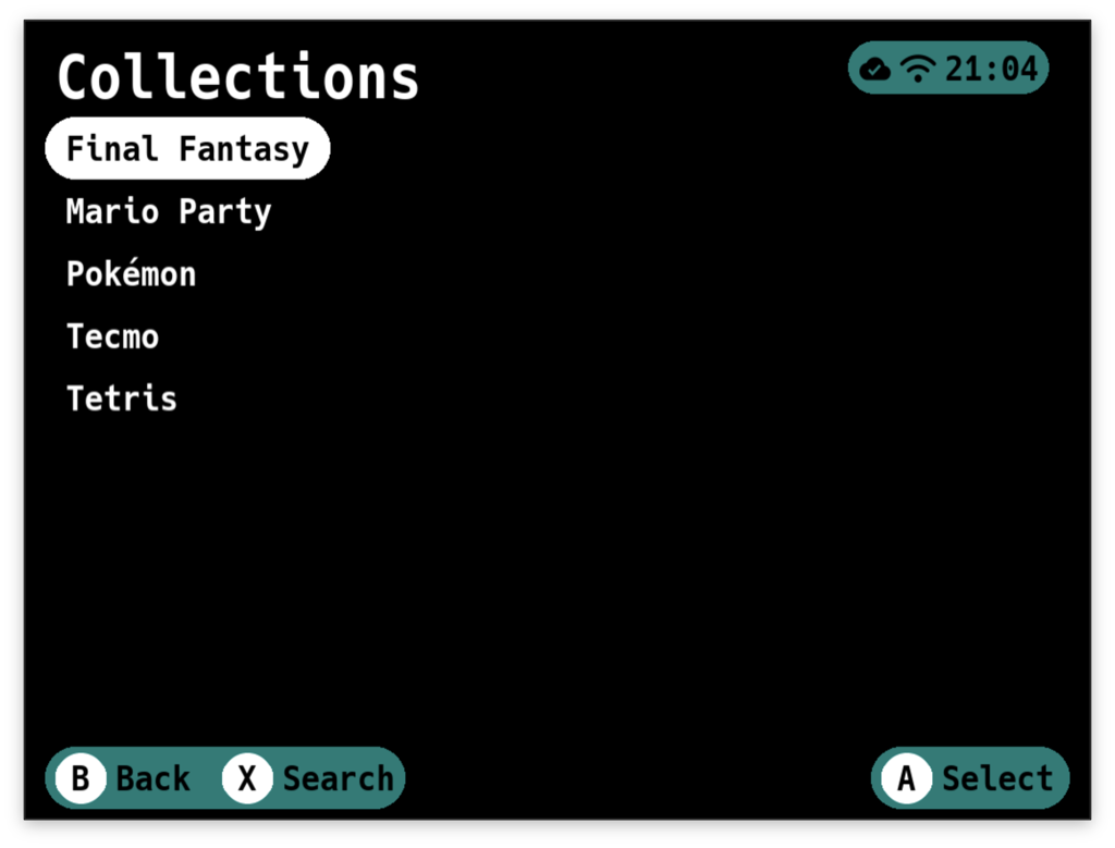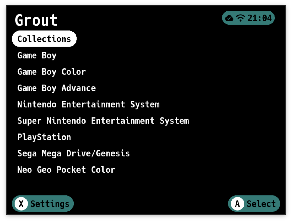 Up/Downto scroll through platformsAto select a platform or collectionXto open SettingsYto open the Save Sync menu (when Save Sync is enabled in Manual mode, or when issues occur in Automatic mode)Selectto enter reordering modeBto quit Grout