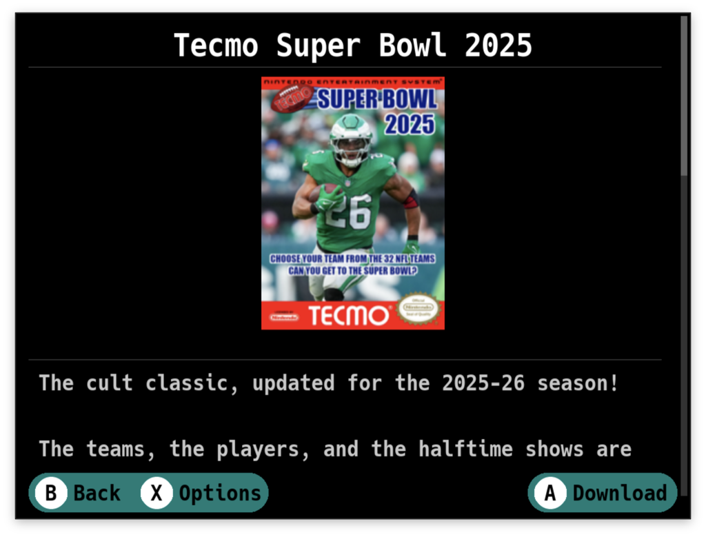 Ato download the game (orXif a file version dropdown is present)Yto open Game OptionsBto go back without downloading