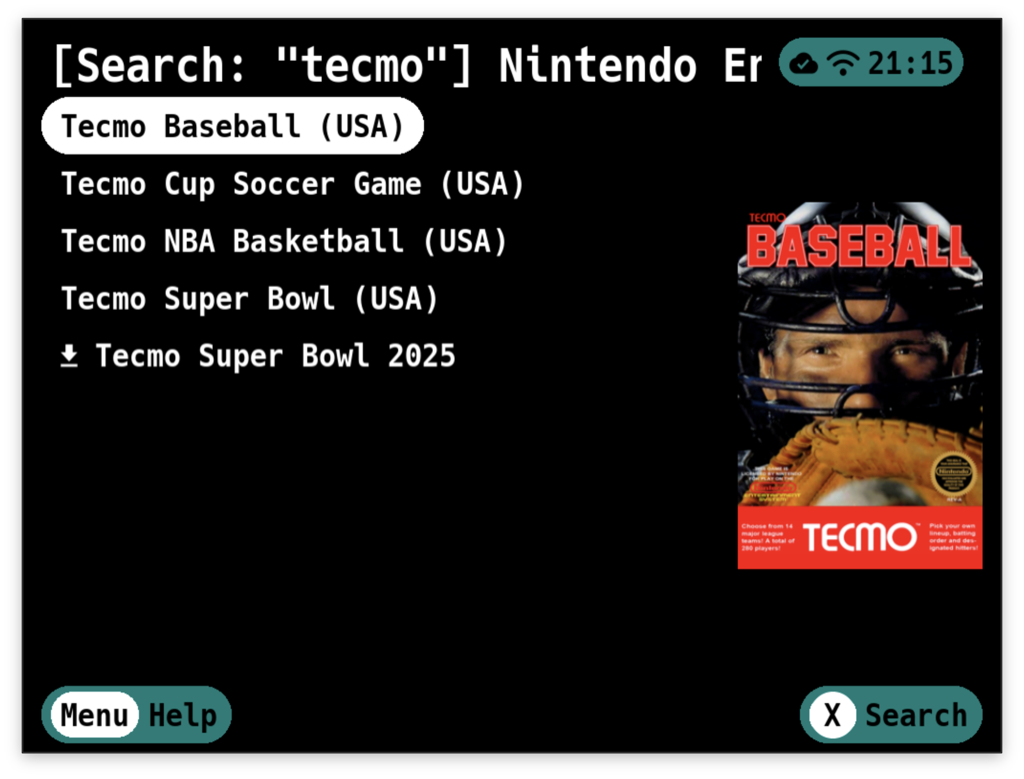 Type your search term using the on-screen keyboard and confirm. The game list will filter to show only matching titles. The search is case-insensitive and matches anywhere in the game name.